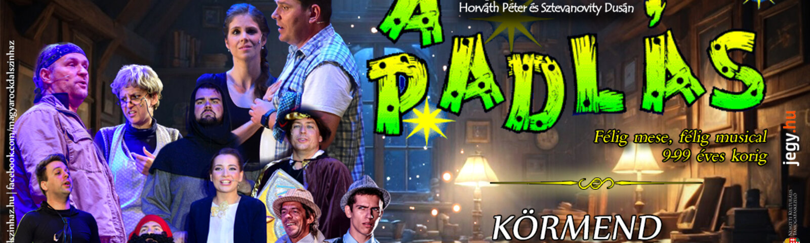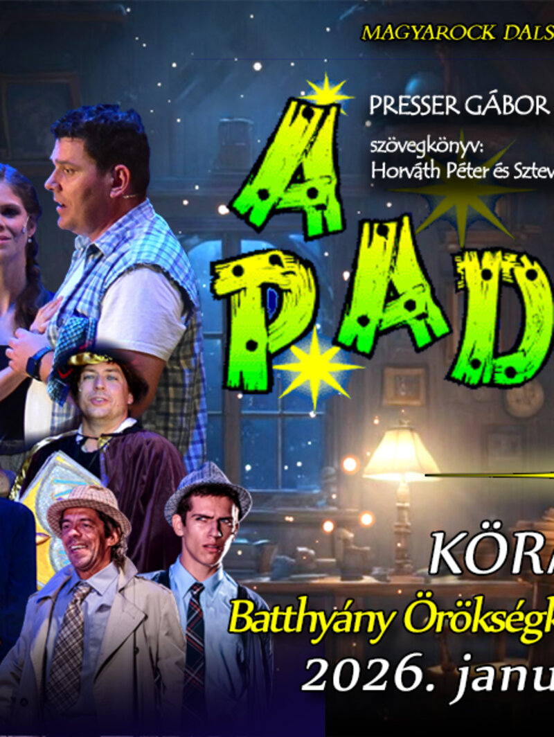 A Magyarock Dalszínház előadásában látható A padlás Presser Gábor, Sztevanovity Dusán és Horváth Péter klasszikus, „félig mese – félig musical” alkotása, amely 2026-ban is a társulat egyik legnépszerűbb repertoárdarabja. A produkció különlegessége, hogy a társulat több mint 15 éve játssza sikerrel, gyakran különleges szabadtéri helyszíneken, például a dél-komáromi Monostori Erődben.Az előadásrólA történet az „Ég és Föld között” játszódik egy varázslatos padláson, ahol Rádiós, a fiatal tudós él. Ide érkezik meg négy szellem, akik 530 éve keresik az utat az „örök fény birodalmába”, de csak az láthatja őket, akinek „tiszta a szíve, mint a gyermeké”. A cselekményt bonyolítja a gengszter Barrabás érkezése, a rendőrségi nyomozás és Mamóka szilvás gombóca, miközben felcsendülnek az olyan örökzöld slágerek, mint a Fényév távolság vagy a Szilvásgombóc.Főbb jellemzők
