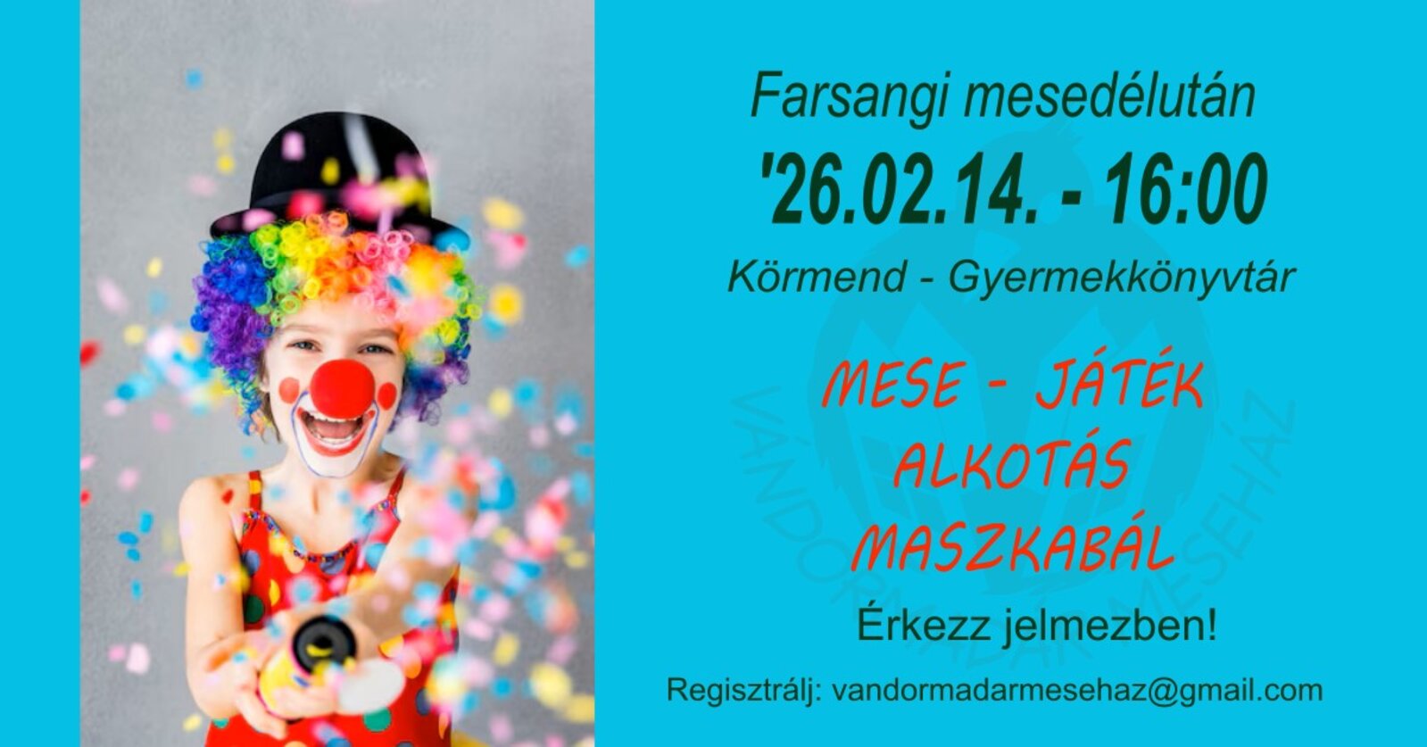 Szeretettel várom az óvodás és kisiskolás gyerekeket jelmezbe bújva a farsangi mese foglalkozásra!